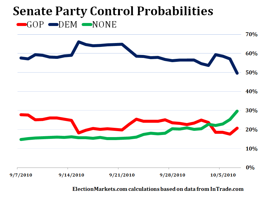 At the same time, the market is not expressing great confidence in the Republicans ability to control 51 seats (remember that under this contract, only a Joe Miller victory would accrue to the Republicans in determining control).